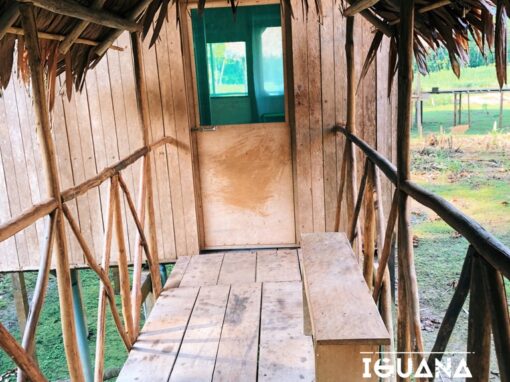 El albergue está construido con materiales propios de la zona, respetando la naturaleza, el ecosistema y la comunidad a la que pertenecemos. La edificación se levanta a más de 3 metros de altura del suelo debido al elevado caudal del río Amazonas durante la temporada de lluvias.